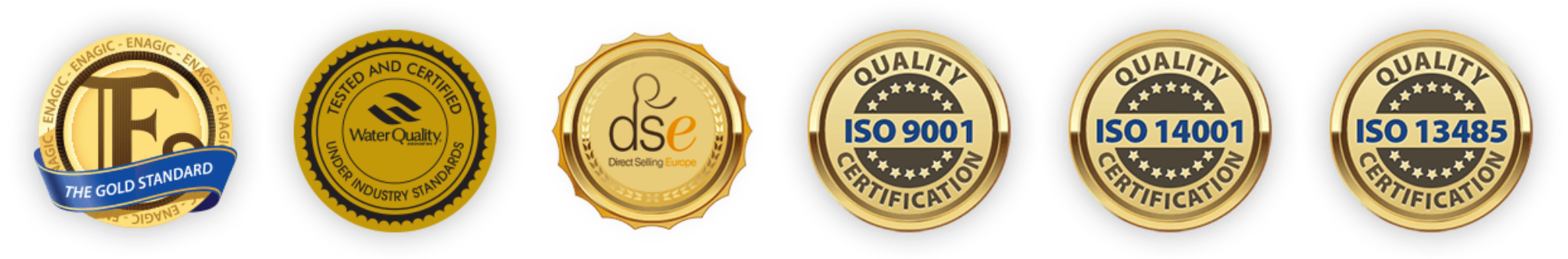 * Enagic Global est certifiée ISO 9001, ISO 14001 et ISO 13485 pour le contrôle de la qualité et la gestion environnementale, le sceau d’or de la Water Quality Association pour la certification des produits, et est membre en règle de la prestigieuse Direct Selling Association.